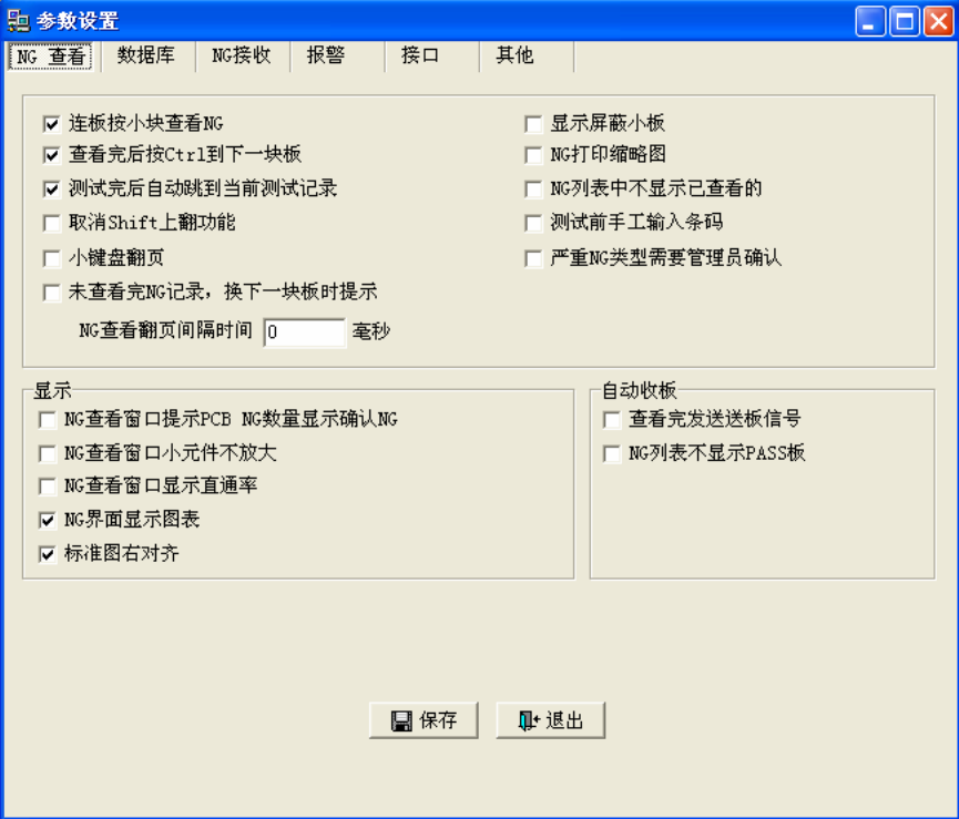 保存统计数据至 数据库: 保存 SPC 查询时需要的 数据。 保存误判 NG 至数据库:保存误判数 据。 自动保存至数据 库:测试 完后不需要查看 ,自动保存数据 。 连板按大板保存 至数据库 :连片信息按一 块板保存到数据 库。 保存上传数据: 配置中心 服务器时需要使 用。 开启软件时自动 执行同步 :打开 NG 查看时自 动从中心服务器 同步数据。 SQL 服务器名称 :设置数据库的相关设置 (请勿擅自改动 ) 。 配置数据库: