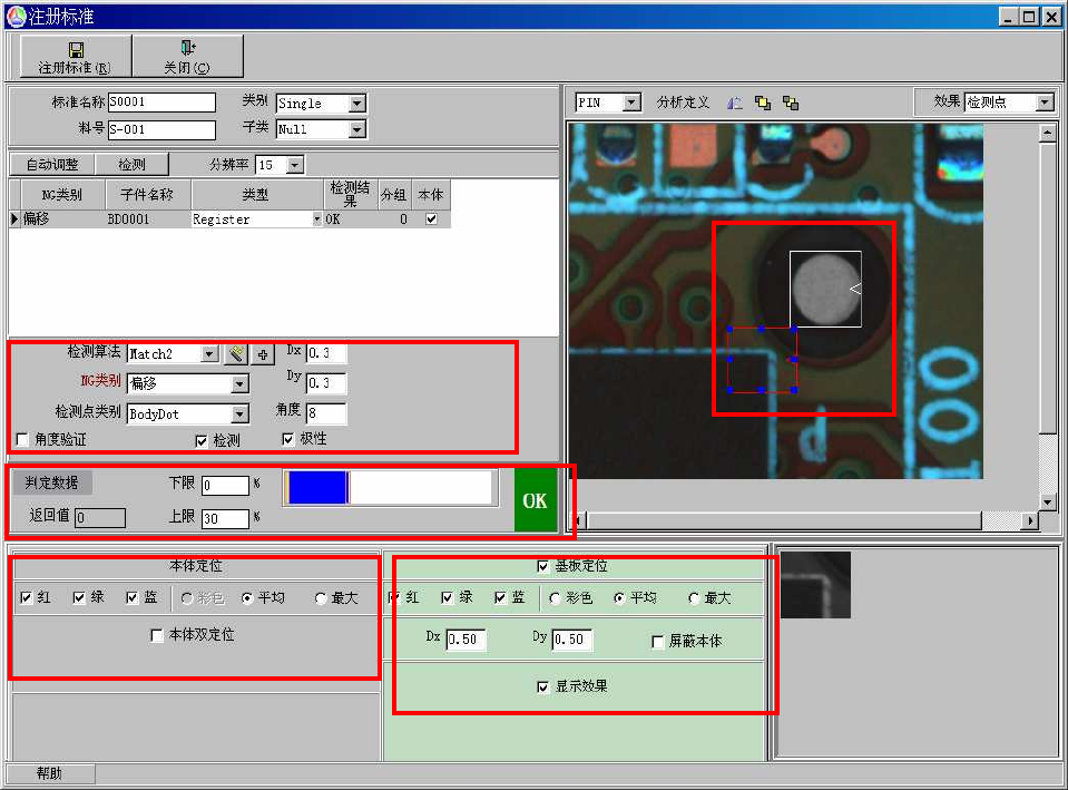 基板定位参数区域:色彩通道选择【红】+【绿】+【蓝】;图像方式选择【均值】;【Dx】和【Dy】都为 0.5;