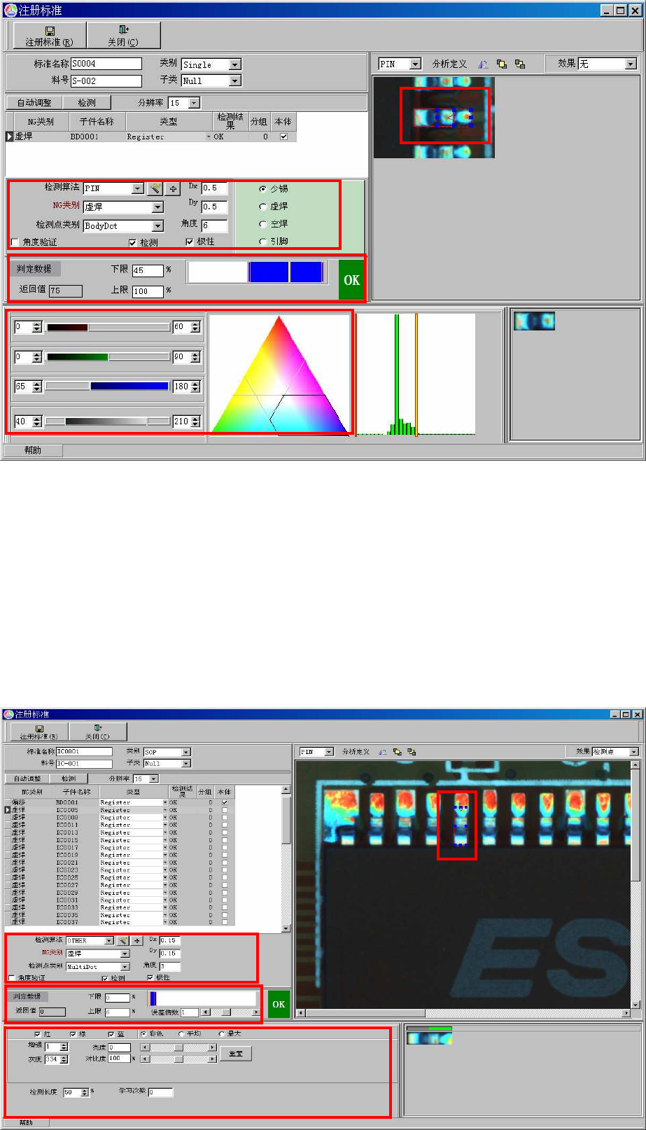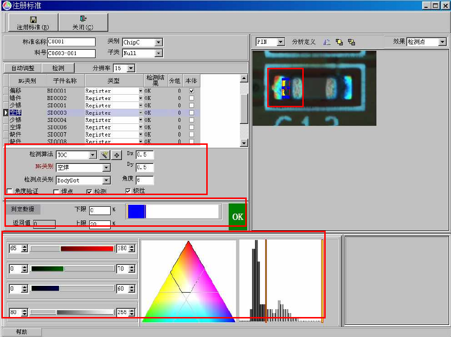 ④ 抽色参数:“少锡”的抽色参数为红(0, 60)、绿(0, 90)、蓝(65, 180);“空焊”的抽色参数为红