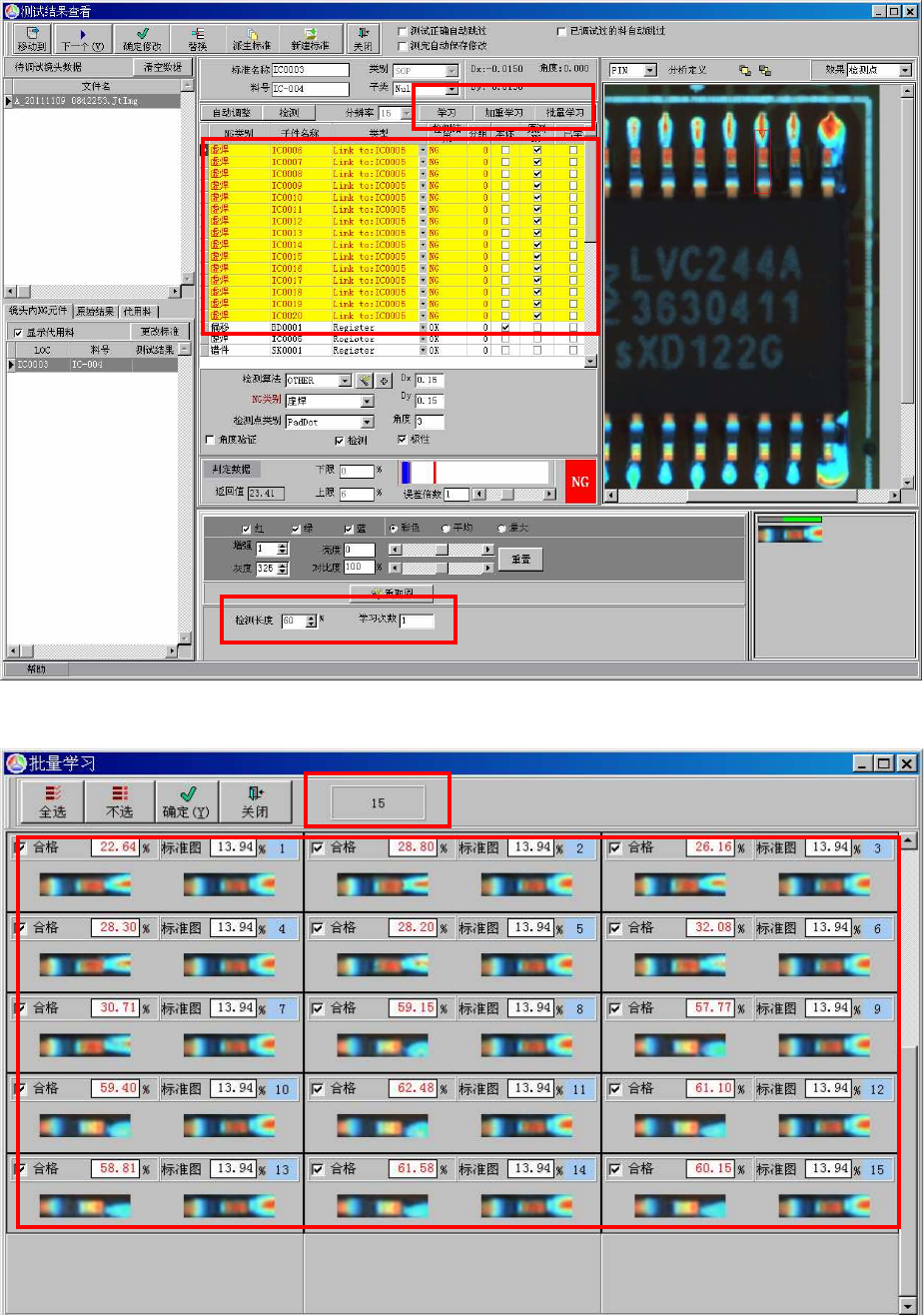 上图为“虚焊”的调试窗体,图中①区域中“虚焊”误报的检测点数量超过 3,则需要采用批量学习调试,