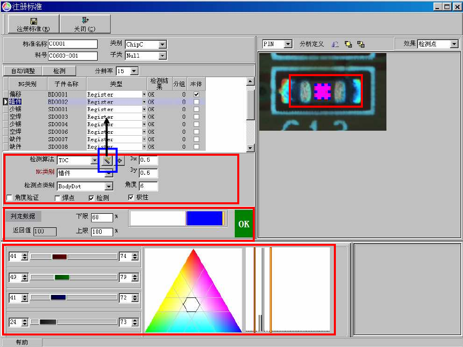 ③ 错件的判定参数区域:默认参数为(60, 100)。
