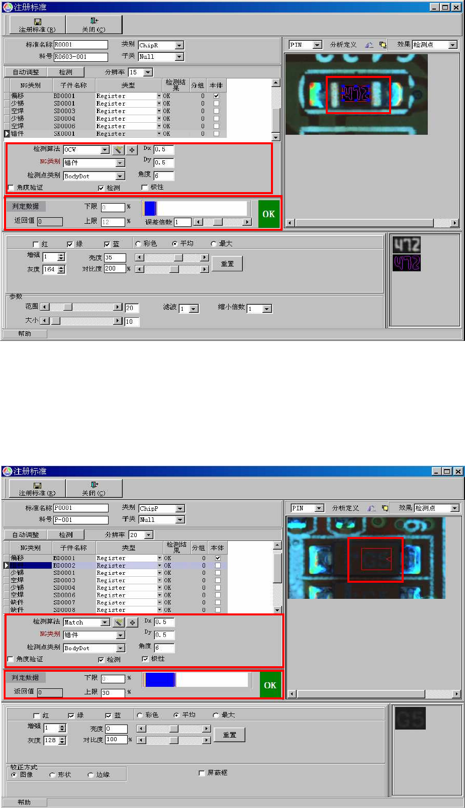 当错件采用“ OCV ”算法 时, 其注册窗体 如下: 上图为“ OCV ”算法下的 注册 窗体,说明 如下: ① ROI 区域:错件框 大小要稍微大于电阻本 体的丝印范围, 框 住所有的丝 印区域,无 其他干扰成分 。 ② 检测算法区域: 【检测算法 】选择“ OCV ” ,其他参数 见②区域。 ③ 错件的判定区域 :默认参数范围 为( 0 , 12 ) 。 提示 提示 提示 提示 : : : :当 元件丝印具有方向限制时 当元件丝印…