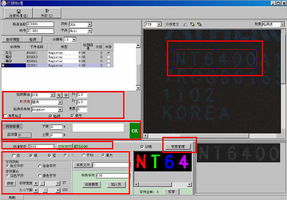 ④ 标准字符区域:标准字符为 T640,返回值为 NT6400,标准字符为返回值的子集,则 OK。