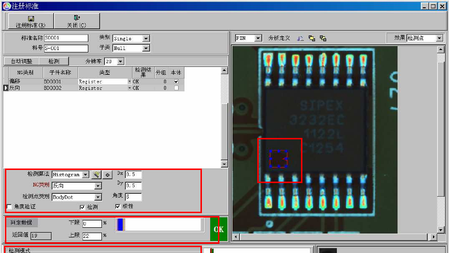上图为“缺件”误报,对于此类误报,选择该变缺件的判定范围,上图中选择将判定范围的【上限】增大到