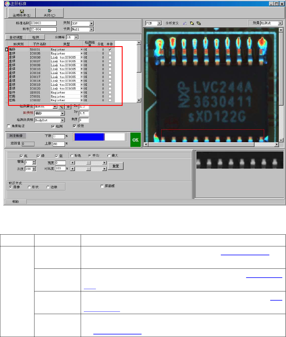 如上图①中为极 性二脚件 的所有检测项。 其注册与调试如 下: 元件类型 元件类型 元件类型 元件类型 检测项 检测项 检测 项 检测项 说明 说明 说明 说明 本体框 本体框的作用是 用于定位 、偏 移。 其注册与调试见 < 炉后的基本 检测项 > 中 < 偏移 > 中采用“ M atch ”算法的“偏移 ”算法。 少锡框 少锡框的作用是 用于检测 焊点的爬锡状况 。 其注册与调试见 < 炉后的基 本检 …