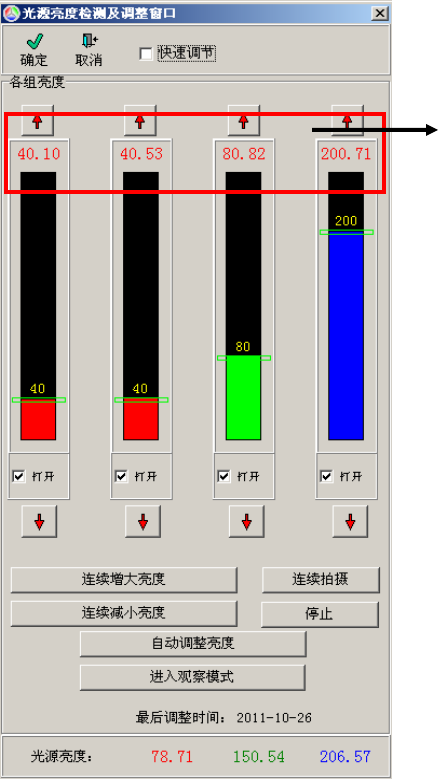 上图为炉前的光源标准,炉前从上而下的光源分布依次为红、红、绿、蓝,光源亮度标准分别为 40、40、80、