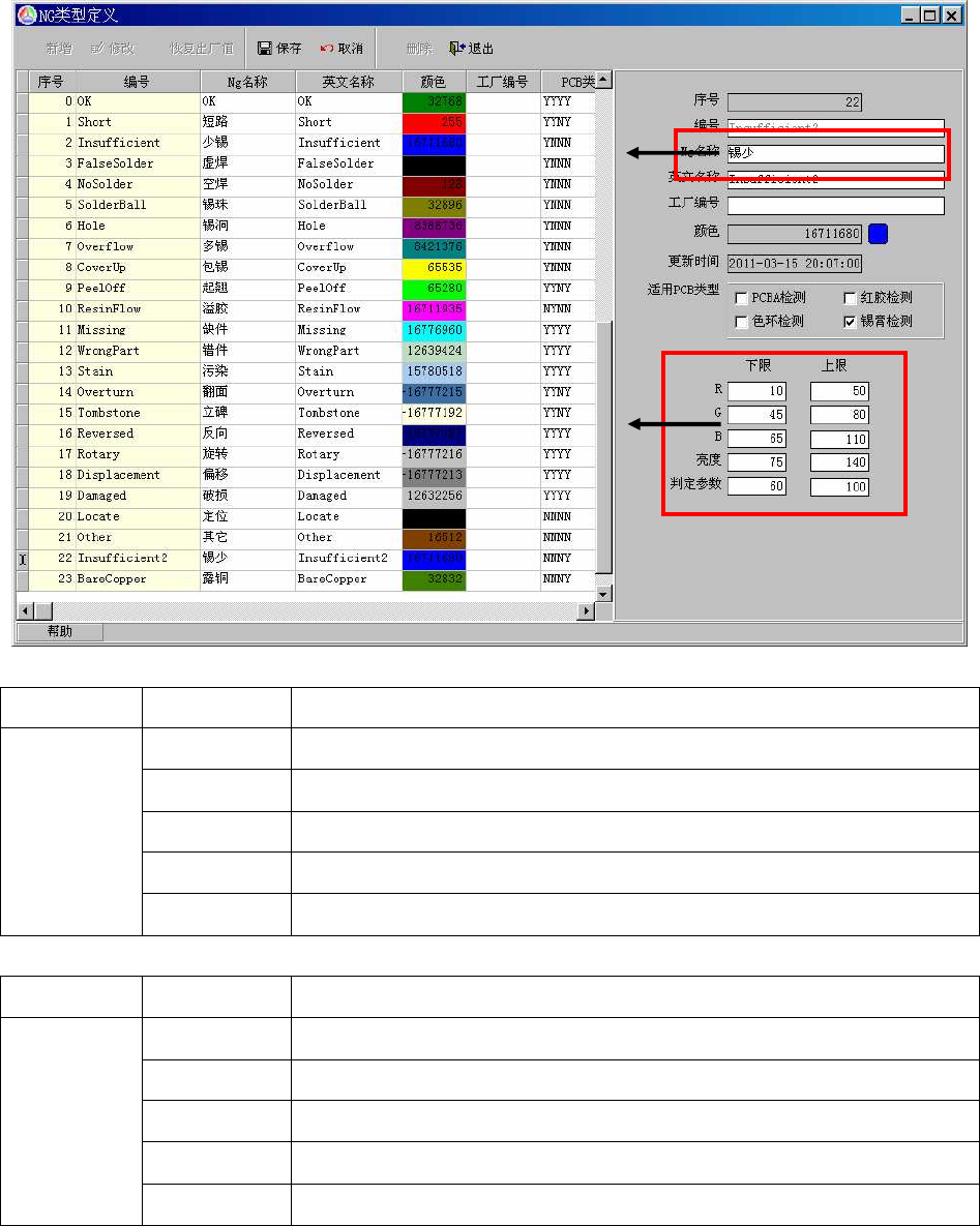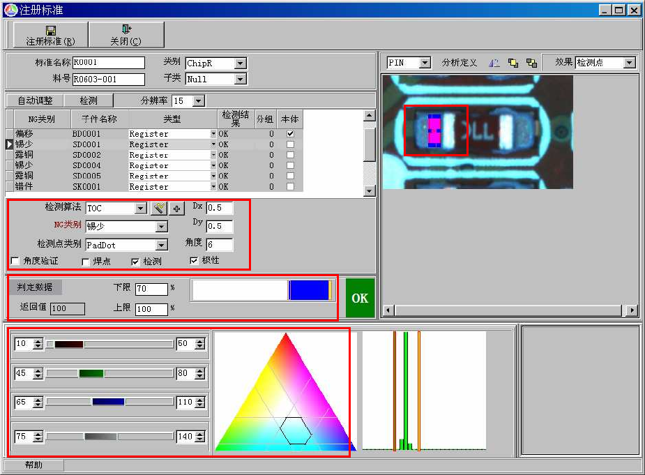 炉前检测前首先要确定锡膏和铜箔的抽色参数,将锡膏和铜箔的抽色参数写入 NG 类型名的系统参数中,以便