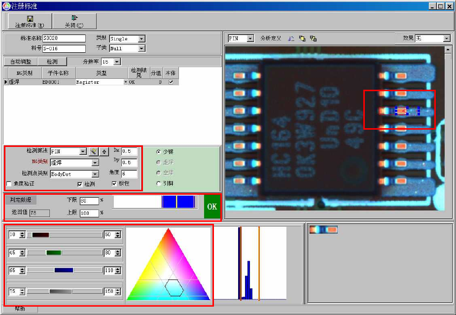 ④ 锡少的抽色参数:锡膏的抽色参数,默认红色范围为(10, 50),绿色范围(45, 80),蓝色范围(65,