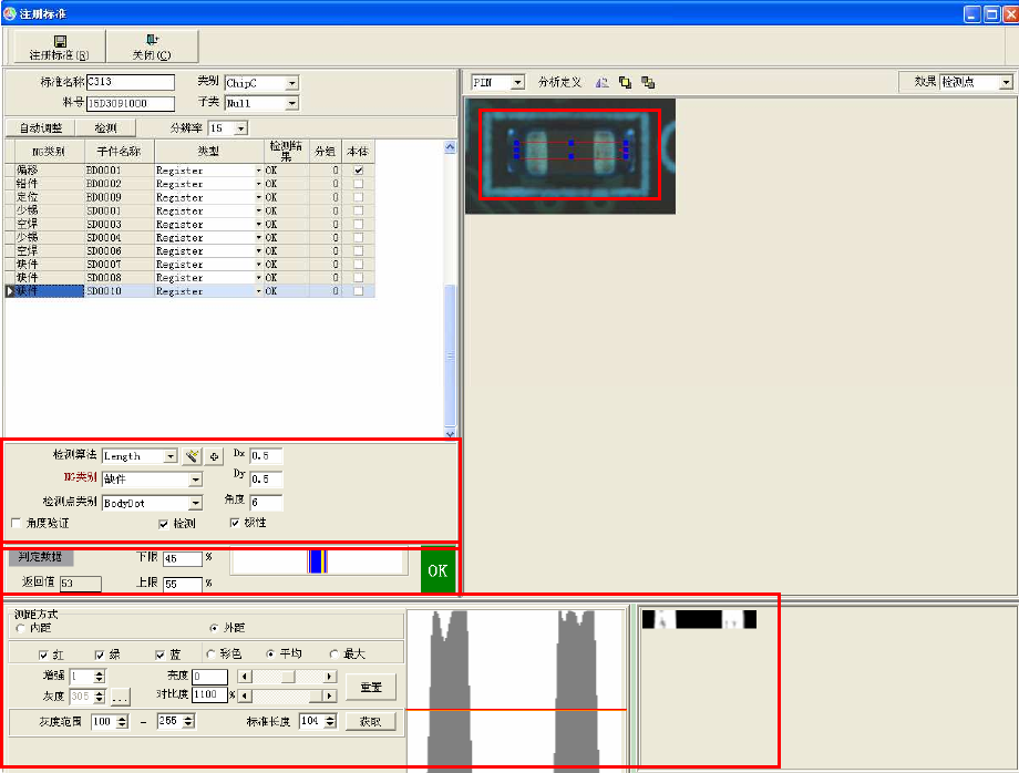 上图中,红色框为本体框、蓝色框为锡少框(露铜框)、紫色框为错件框、白色框为缺件框。其注册窗体如
