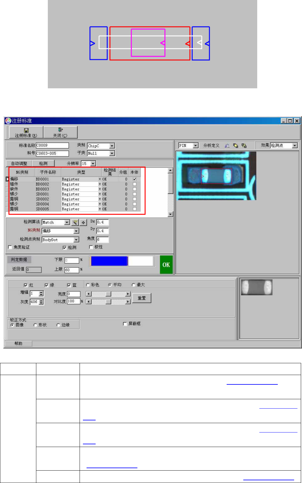 上图中 ,红色框为 本体框、蓝色 框为锡少框 (露铜框) 、紫色框为错 件框、白色 框为缺件框 。其注册窗体 如 下: 上图为电容的注 册窗体, ①区域包括所有 的电容检测项, 说明如下 : 元件类型 元件类型 元件类型 元件类型 检测项 检测项 检测 项 检测项 说明 说明 说明 说明 本体框 本体框的作用是用于定位 、偏移。其注册与调试见 < 炉后的基本检测项 > 中 < 偏 移 > 中采用“ Matc h …