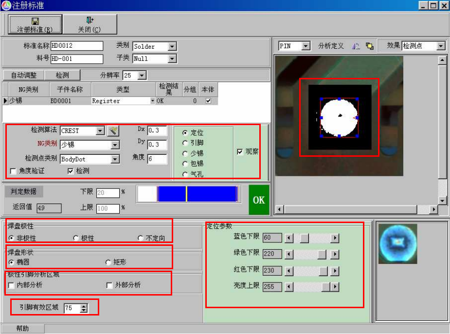虚焊框的作用是用于检测焊点的好坏状况。其注册与调试见<炉前的基本检