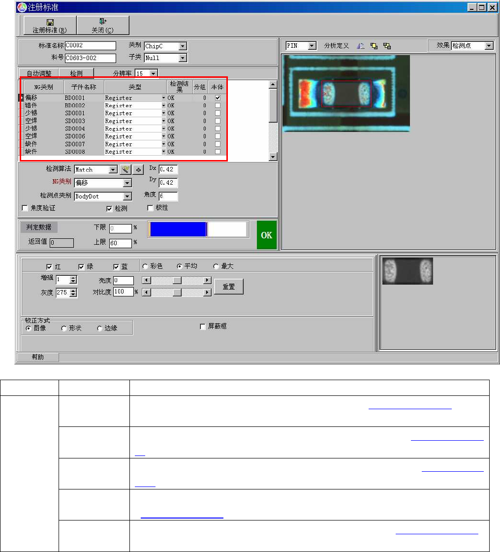 上图为 DIP 件 的注册窗体, ①区域为其所有 检测项,说 明如下: 元件类型 元件类型 元件类型 元件类型 检测项 检测项 检测 项 检测项 说明 说明 说明 说明 DIP 件 少锡 本体框的作用是 用于检 测 DIP 件的好坏。其注册 与调试见 < 波峰焊的 基本检测 项 > 中“插件 ”算法。 5.4.2. 短 短 短 短路 路 路 路 波峰 焊检 测的 短路 的 注册 和调 试 与炉 后检 测 的短 路注 册 与调…