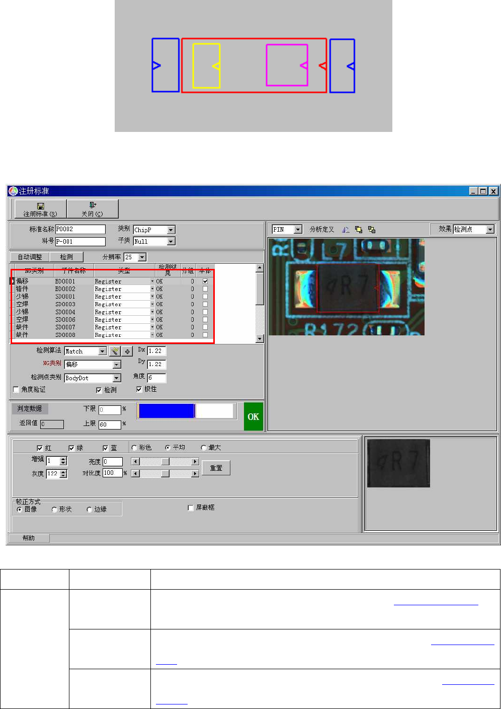 上图中,红色框为主体框,蓝色框为少锡(空焊、缺件)框,紫色框为错件框,黄色框为极性框。其注册窗