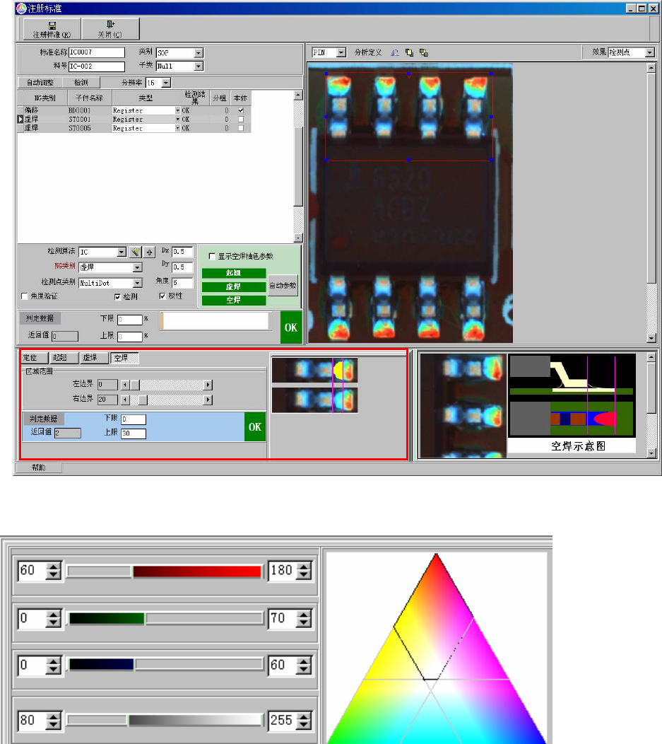 空焊是检测 IC 引脚是否发生空焊(无焊锡现象),采用的是抽色参数,抽取 IC 空焊发生区域的铜箔成