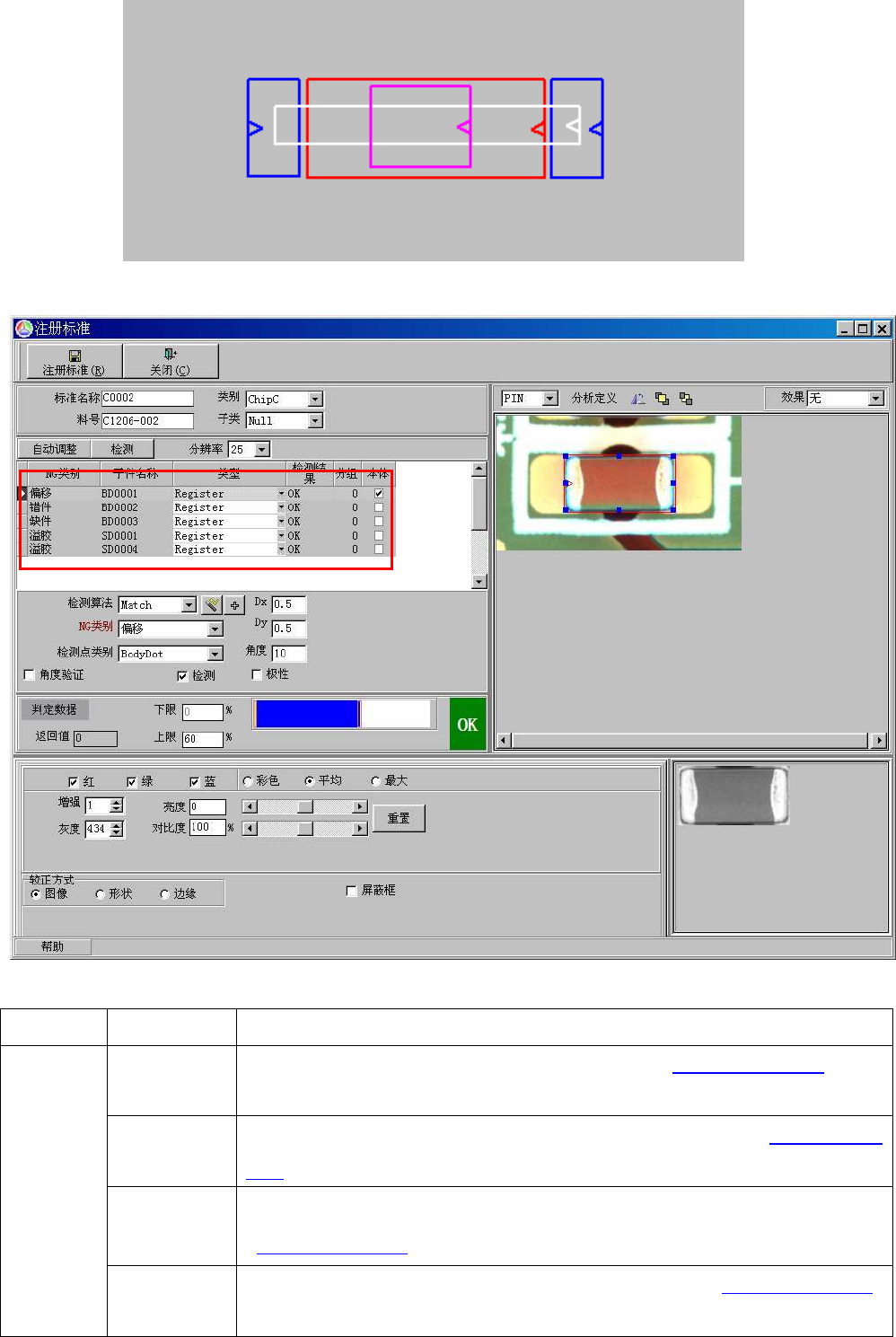 6.4.2. 电阻 电阻 电阻 电阻 电阻的元件标准 包括本体 框、错件框和 2 个溢 胶框,其元件示 意图如下: 见上图,红色 框为本体 框,黄色框 为错件 (缺件)框, 蓝色框为溢胶 框,缺件框的位置基本 一致。其 注册窗 体如下: 上图为电阻的注 册窗体, ①区域包括所有 的电阻检测项, 说明如下 : 元件类型 元件类型 元件类型 元件类型 检测项 检测项 检测 项 检测项 说明 说明 说明 说明 本体框 本体框的作用是用于定位 …