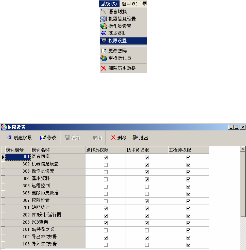 7.3 权限管理 7.3.1 权限设 置 权限设置 权限设置 权限设置 选择菜单“系统 ”栏下的 “权限设置” ,打开“权限 设置”界面。 选择操作员,技 术员,工 程师的权限后, 保存。 若不小心删除了 某模块, 可以点击创建权 限来重置所有权 限。 7.3.2 操作员 设置 操作员设置 操作员设置 操作员设置 选择菜单“系统 ”栏下的 (操作员设置) ,打开“设 置窗口” 。