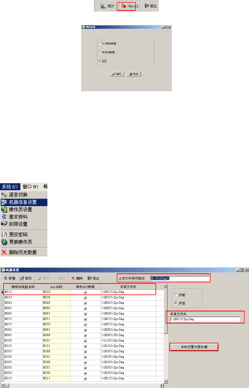 需要导出数据时 ,可点 击 Excel 按钮进行导 出操作: 可以选择 PCB 明细数据, NG 明细数 据 和 ALL 。 导出时可以选择 三种格式 文档(文本文档 , Excel 文 档, W ord 文档) 。 7.5 中心服务器 当需要在一台电 脑查看所 有线别的 NG 数据和 检查机器运行情 况时,可以将 该主 机设置为中 心服务器 。 中心服务器可对 同一局域 网里的所有 AOI 进行远程监控,在服 务器上可查看 各 AOI…