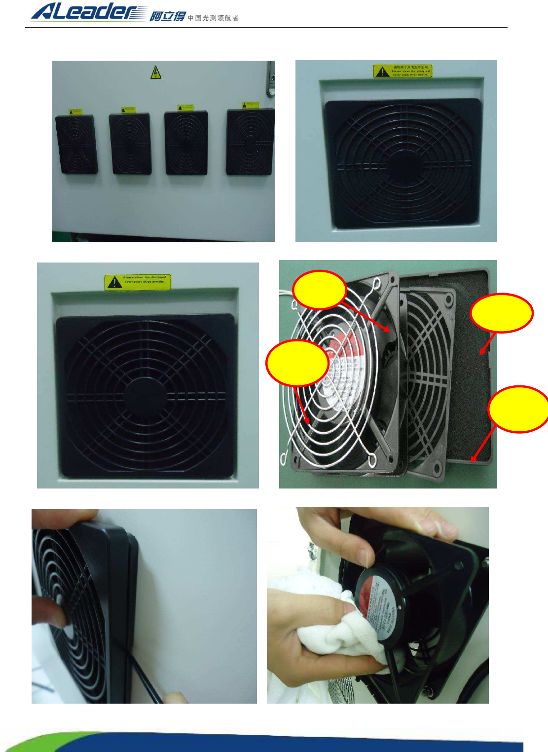 地址: 东莞市东城区牛山金鸡岭 兴华工业园 F 栋 电话: +86-0769-22629057 传真: +86 -0769-22629107 Http:www .aoichina.com TEL:4001-189-123 F AX:0769-23102060 Page: 204 ④ 清洁完成后,装好风扇, 收拾工具 。 图 3-1 机 器后面风扇 图 3-2 机 器左侧面风扇 图 3-3 机 器右侧面风扇 图 3-4 机器 装置 图 3…