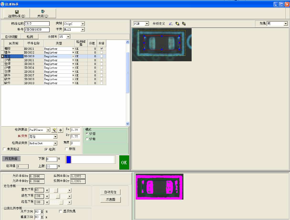 亮度,形状来确定检测区域位置,以此来计算元件本体相对偏移值的算法。主要用于检查焊盘明显的贴片元