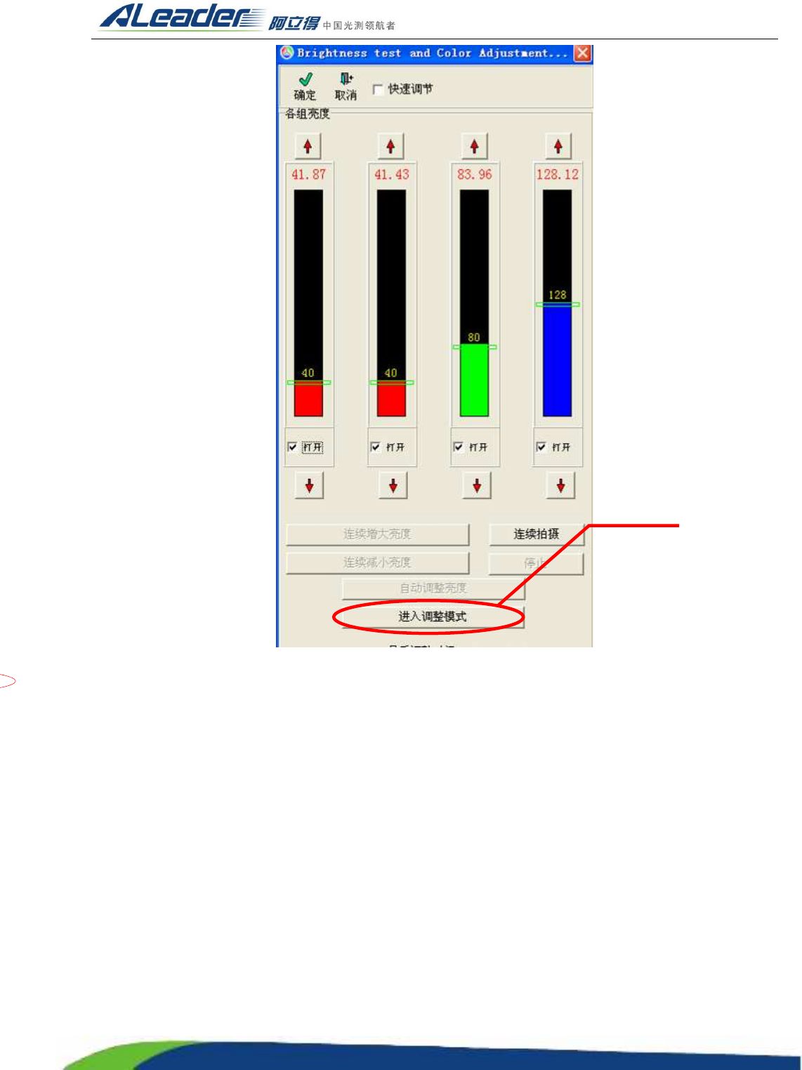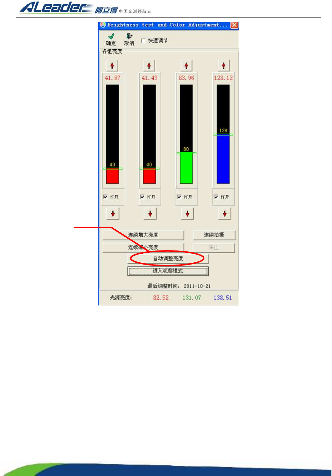 地址: 东莞市东城区牛山金鸡岭 兴华工业园 F 栋 电话: +86-0769-22629057 传真: +86 -0769-22629107 Http:www .aoichina.com TEL:4001-189-123 F AX:0769-23102060 Page: 21 1 图3-28 光源亮度检测以色彩校正窗口 ③ 点击自动调整亮度即可, 如图3-29所示。 如果红、 绿、 蓝色彩处在设定 的值时,则不需光 源亮度检测色彩校 正…