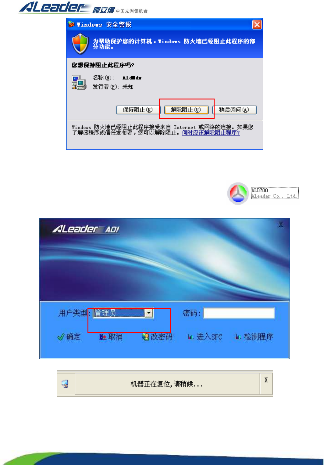 地址: 东莞市东城区牛山金鸡岭 兴华工业园 F 栋 电话: +86-0769-22629057 传真: +86 -0769-22629107 Http:www .aoichina.com TEL:4001-189-123 F AX:0769-23102060 Page: 243 选择解除阻止。 就此,软件已经 安装到机 器上: 接下来需要设置 相关的参 数: 检查设备急停状况(急停开关处于松开 状态) ,排除打开桌面上的 ALD700 …