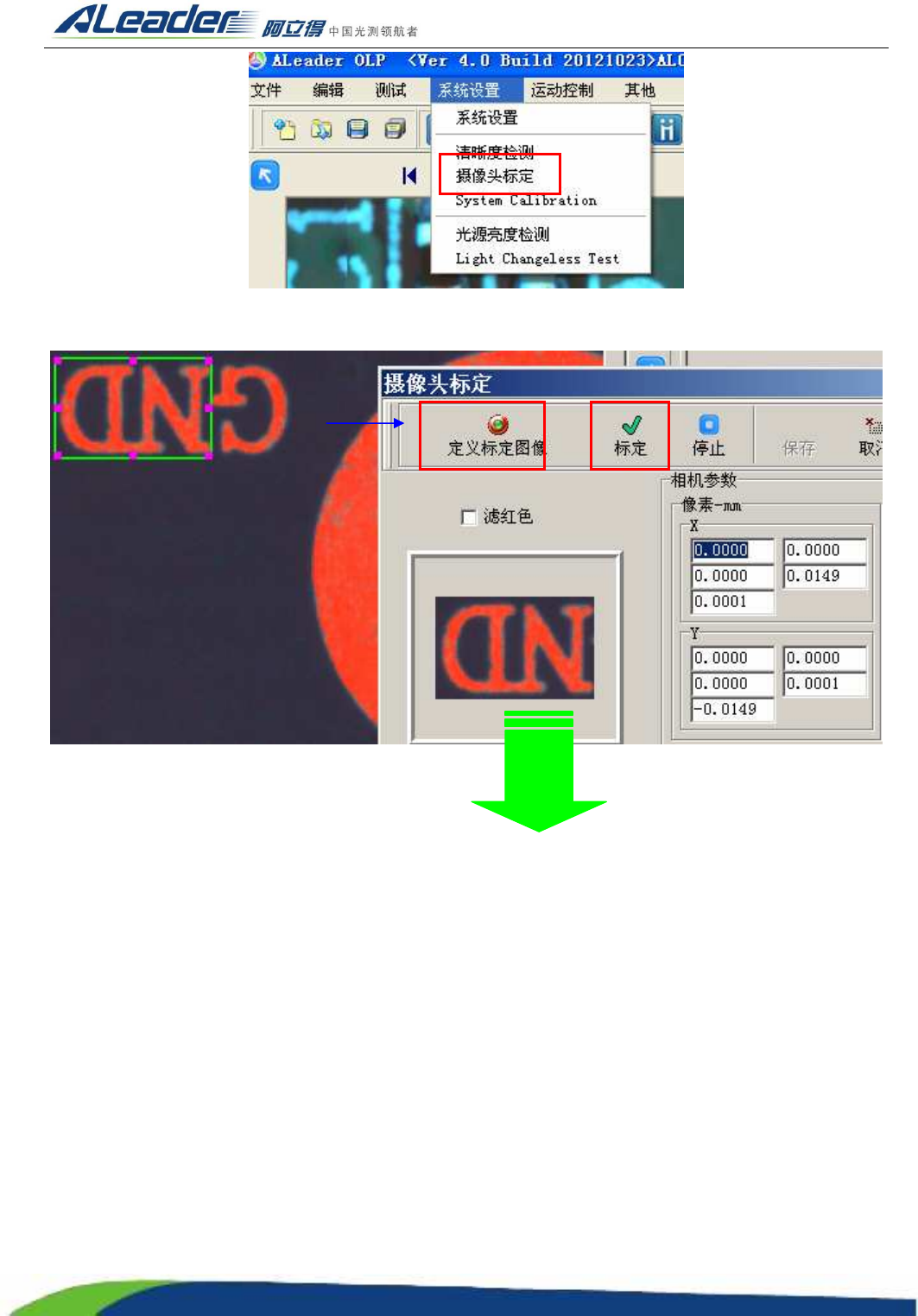 打开,弹出摄像头标定菜单,移动和调整给定的绿色标定框,在 PCB 上取一个 0805 以下的字符或原