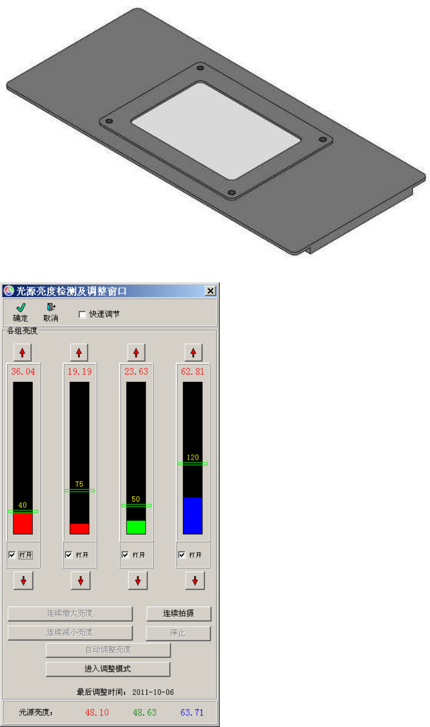 2) 以管理员模式点击菜单:〔系统设置〕→〔光源亮度检测〕,进入亮度检测窗口,点击(进入调整模式)