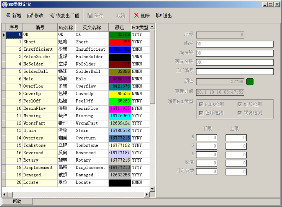 2. 修改: 可对当前行的 NG 类型在窗口右边进行修改, 改完后要保存才生效;