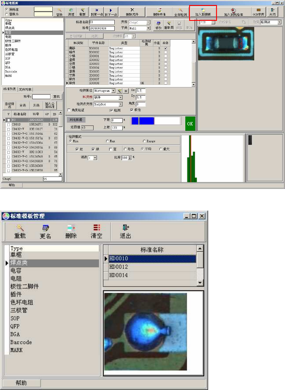打开标准图库 [编辑]->[编辑标准图库], 选中需要加入到标准模板的标准, 点击下图中红色框所示的[加入到