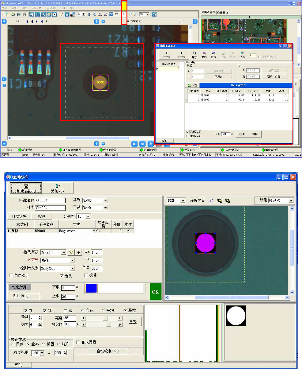 4. 找到 PCB 板上的 Mark 位置, 用标定框按照标准选定 Mark 区域,点击红框 B 中的“注册”按钮;
