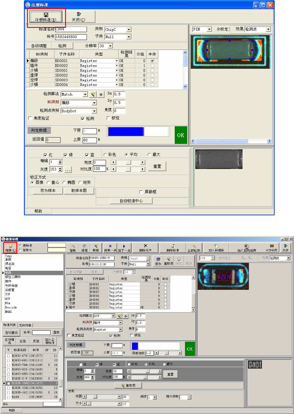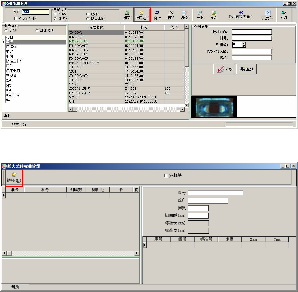 (6) 超大元件 链接 : 链接 到超过一个 FOV 的标准 选定好正确 的公用标 准后 , 点击 [ 链接 ] 即可 . (7) 自动到未 链接料号 : 选中此项后 , 做完 一个料号的标准 后 , 会自动定 位到下一个未链接的料号 . (8) 旋转 90 度 : 将当 前料号对应的所 有元件按 顺时针方向旋 转 90 度 ; (9) 不规则角 度旋转 90 度 : 对不 规则角度 ( 非 0,90,180,270 四个角 度 ) 的…
