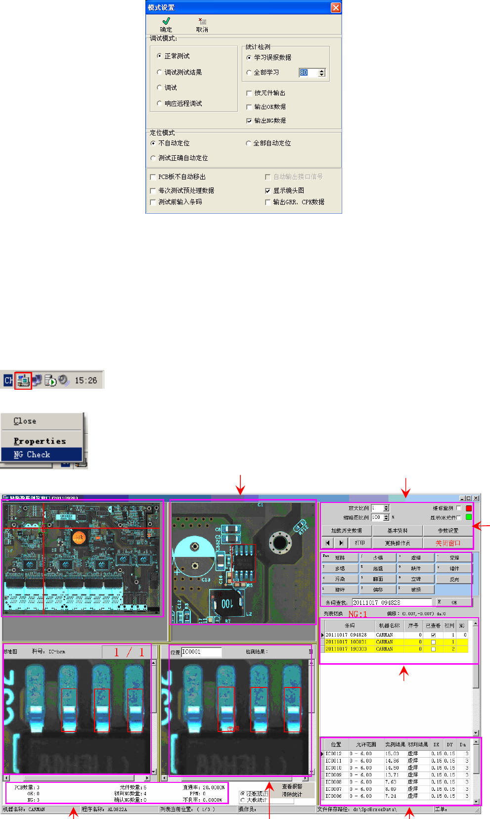 A 区域为整块 板的缩略图 ,可以看 到 NG 元件在板上的大 概位置。 B 区域为 NG 元件 的放大图。 C 区域为该元 件的标准图 像 。 D 区域为该元 件的待测图 像(即现在 正在测试的原 件图像) 。 E 区域为测试 后的数据显 示, 是按板来划 分的(使 用了块设置则会 按照块来 显示信息) 。 F 区域为每块板 上的具 体 NG 数据。 G 为 NG 类型确认区 ,当发现真实 NG 时,可以 在此区域 点击相应的 NG …