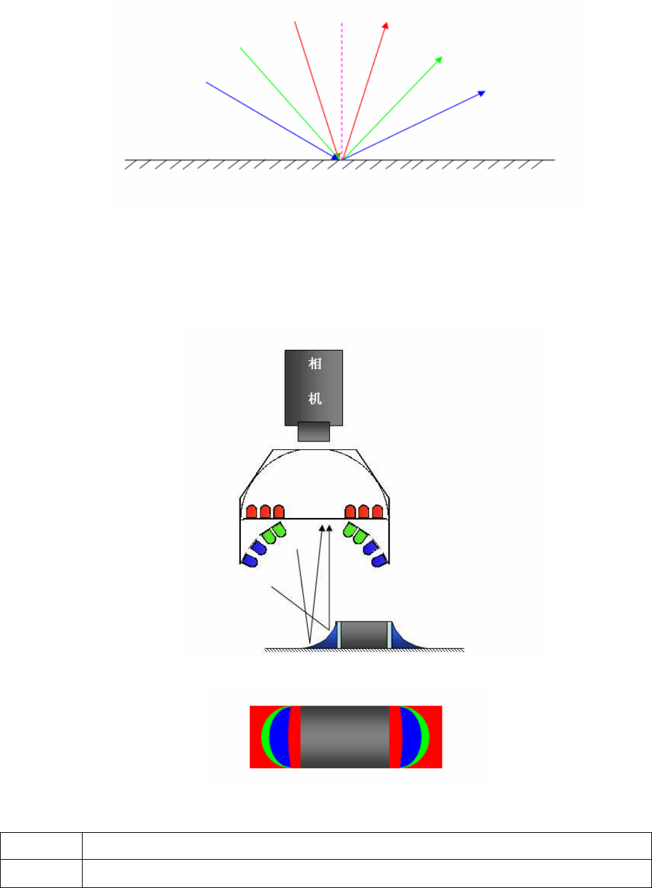 和坡度平缓区域 时,能反 射更多的红光进 入相机,所以该 区域成像 偏重于红色。 绿色 LED 绿色 LED , 分布 在光源的中间一 层, 其作 用区域为 坡度适度的区域 。 在坡度 适度的区域, 此区域能反射更 多的绿光 进入相机,所以 此区域成像偏重 于绿色。 蓝色 LED 蓝色 LED ,分布在 光源的 最下方,其作用 区域是坡度陡的 区 域。在坡度 陡的区域, 能反 射更多的蓝光进 入相机, 所以此区域成像 偏重于蓝色。 根据…
