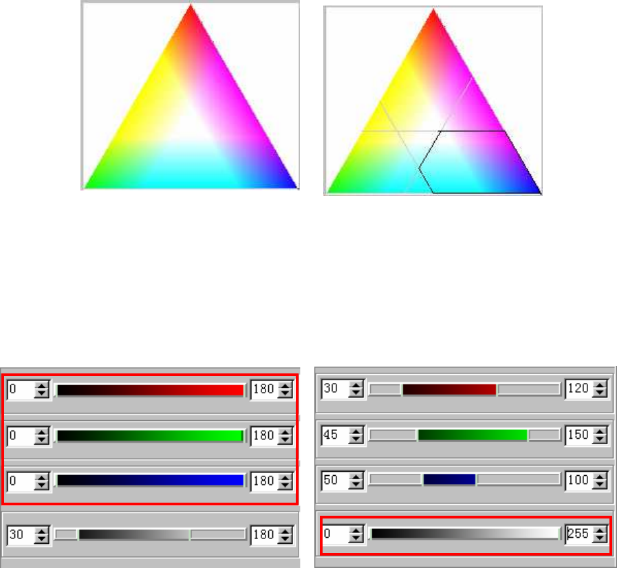 围中的红绿蓝的色度范围都设定为(0, 180),仅仅通过标准亮度范围来抽取符合亮度的色彩点,如下图①;