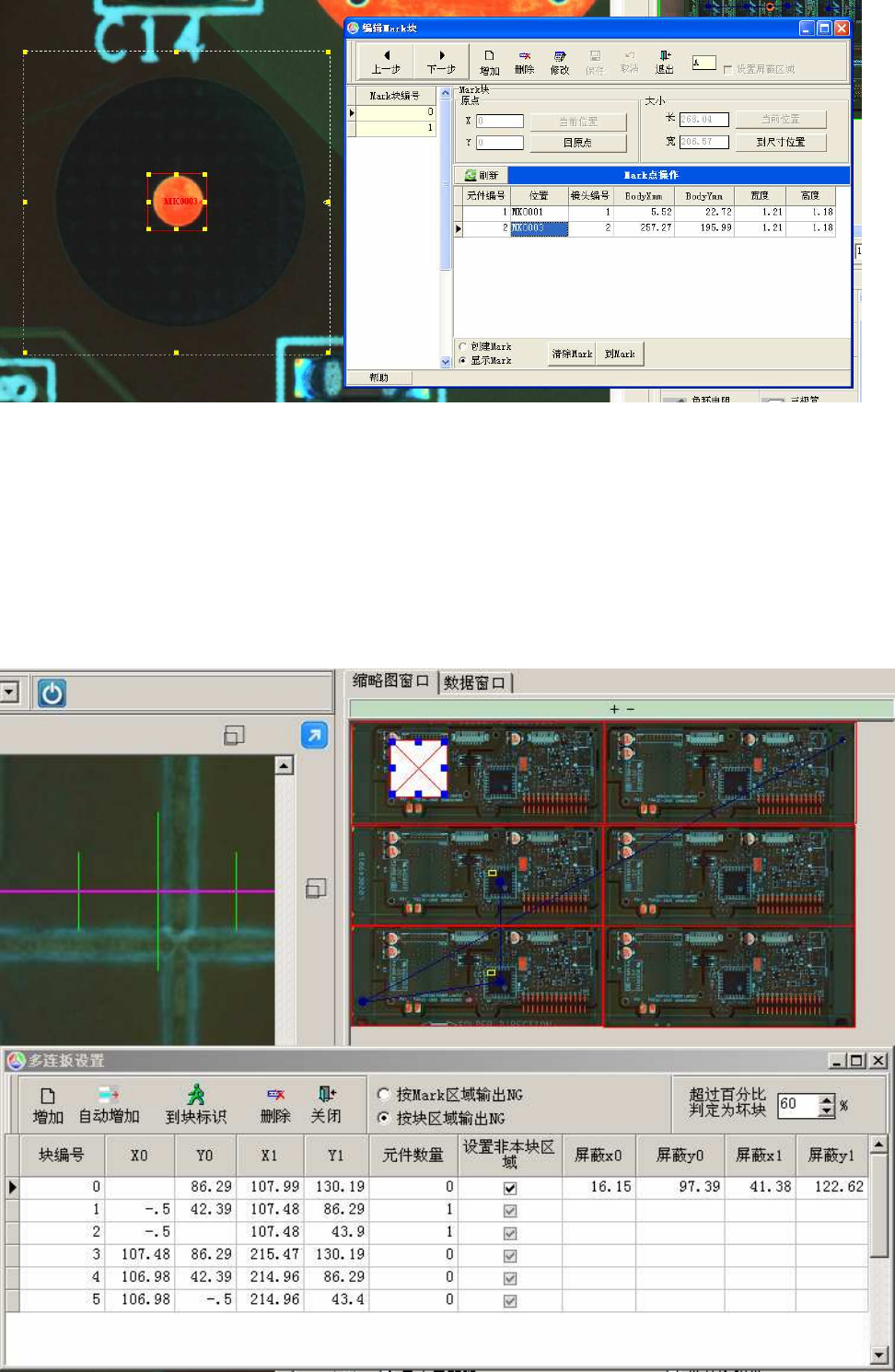 增加 : 增加一 个 Mark 块 , 一个 Mark 块一般包 含两个 Mark 点 ( 允许 1-3 个 Mark 点 ), 通过设定 Mark 原点与 Mark 长宽确定一个 Mark 块的位置与大小 , 对 于不规则 的 Mark 块 , 可以通过勾选 [ 设 置非 Mark 区域 ] 来 剔除 不被包含的区域 ( 如下图 ); 删除 : 删除选 定的 Mark 块 ; 保存 : 将当前 设定进行保 存 ; 到 Mark: 如下…