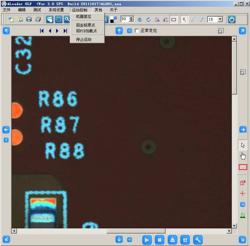 2.6.6 [ 运动 控制 运动控制 运动控制 运动控制 ] 菜单下功 能 菜单下功能 菜单下功能 菜单下功能 (1) 机器复位 使机器强制复位 。 (2) 回坐标原 点(软件原点 ) 回到设置的软件 原点位置 。 (3) 回 PCB 加载点 回到 PCB 加载位置。 (4) 停止运动 使机器终止运动 。