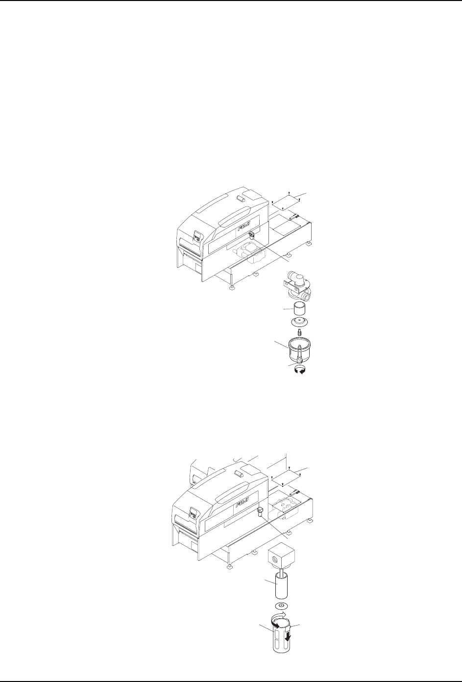 6. 预防保养 QD145-04 202 NXT Ⅱ机械手册 6.9.2 真空泵过滤器的清扫 1. 拉 出模组。 (参考 " 5.1 模组的拉出 / 插入 ") 2. 请将主电源开关 OFF。 3. 取下基座上的盖板。 4. 将真空布管内设定为大气压。 5. 2M-2 基座的时 候,按下面的步骤拆除滤 芯。 a. 松开滤器套下部的螺栓,将滤器套从主体 拆除。 b. 从主体拆除滤芯。 6. 4M-2 基座的时 候,按下…