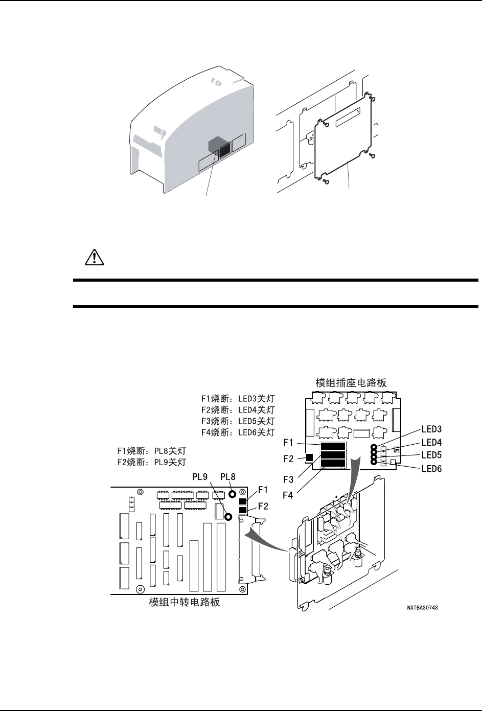 4. 从模组插座电路板拔下保险丝 (F1, F2,F3, F4) 并更换。并且,在拆除保险丝 F1,F3,