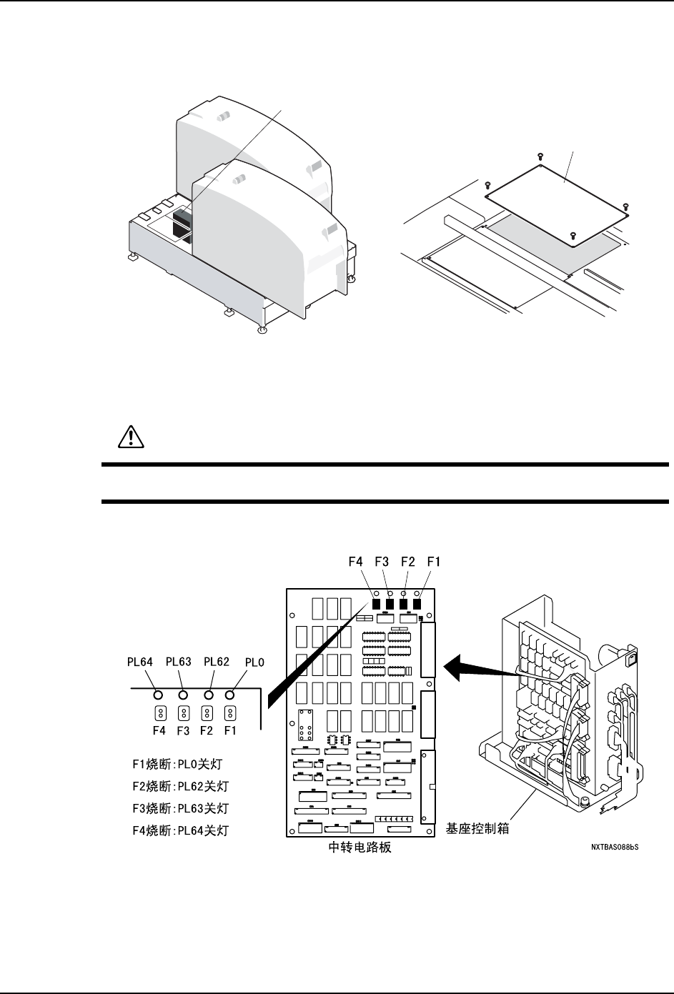 以下显示出基座控制箱的位置。基座控制箱的 I/O 电路板上的保险丝烧断时, 检查保险丝