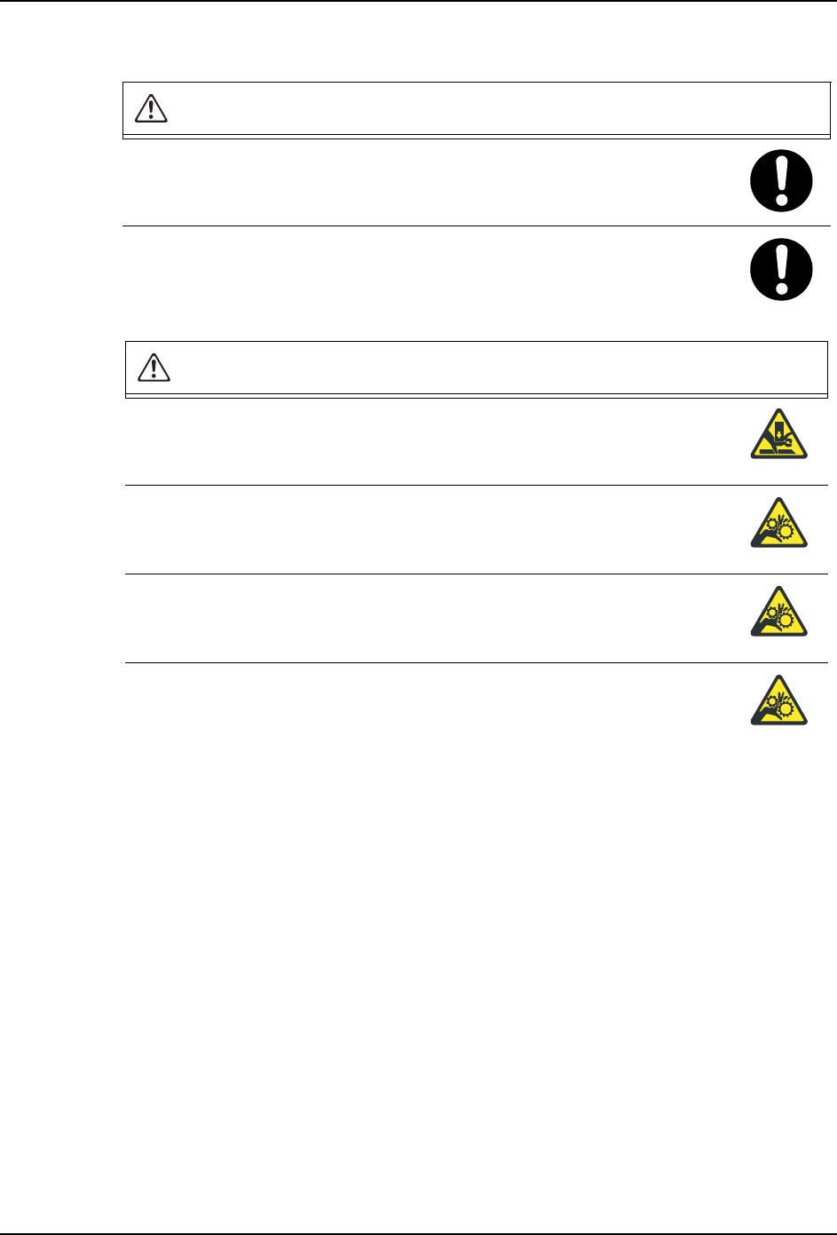 QD145-04 1. 安全指南 NXT Ⅱ机械手册 9 1.3.2 料盘单元 -L 在将料盘单元 -L 安装到机器本体上时,请确认在料盘 单元 -L 与机器本体之 间没有他人。 · 手或者身体有可能被卷入机器而受 伤。 当料盘单元 -L 处于与机器本体分离的状态时,请锁住 脚轮。 · 在不同的地面状态下,被取下的料 盘单元 -L 有可能滑出、与人体相撞导致 人员受伤。 在打开或者关闭料盘单元 -L 的门时,请注意不要被挟 到手指。不要…