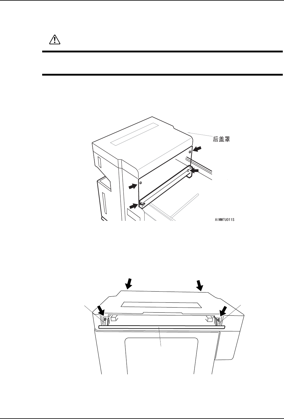 QD145-04 8. 部件的更换 NXT Ⅱ机械手册 373 8.20.3 拆除方法 按照以下步骤,请拆除料盘单元 盖罩。 1. 后 盖罩 拆除固定螺丝 (4 根) ,拆除后盖罩。 2. 顶 盖罩 a. 拆除后侧的螺丝 (2 根) 。 b. 打开顶盖罩前面的门,拆除左右的固定螺 栓。 备注 )这些固定螺栓将电磁吸块一起固定。 c. 拆除顶盖罩。 警告 在拆除·安装料盘单元 -L 盖罩时,必须在将料盘单元 从机器主体上拆除的状态下进 行…