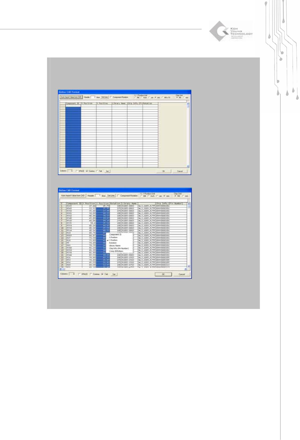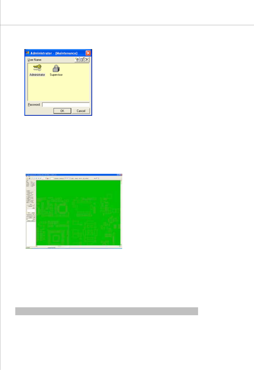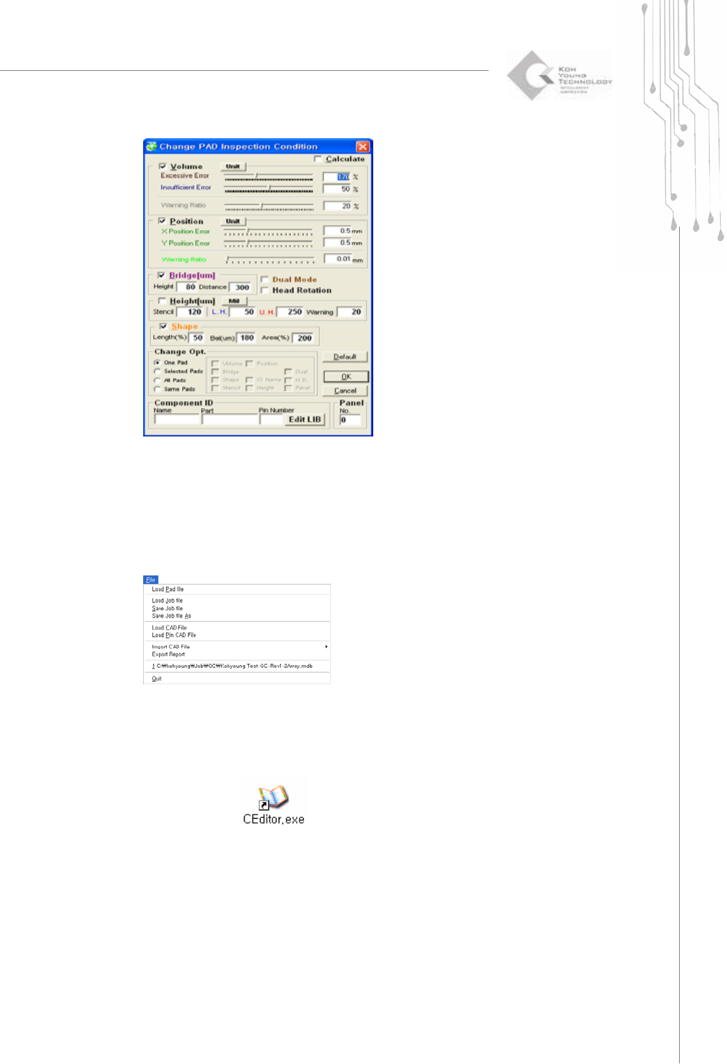 78 | KY-8030 Series (KYOS-2007001_rev0) 3D In ‐ line Solder Paste Inspection Systems 2) Select the desired user account, enter a passw ord and click the OK button. The CEditor program w ill be launched. 3) Cl…