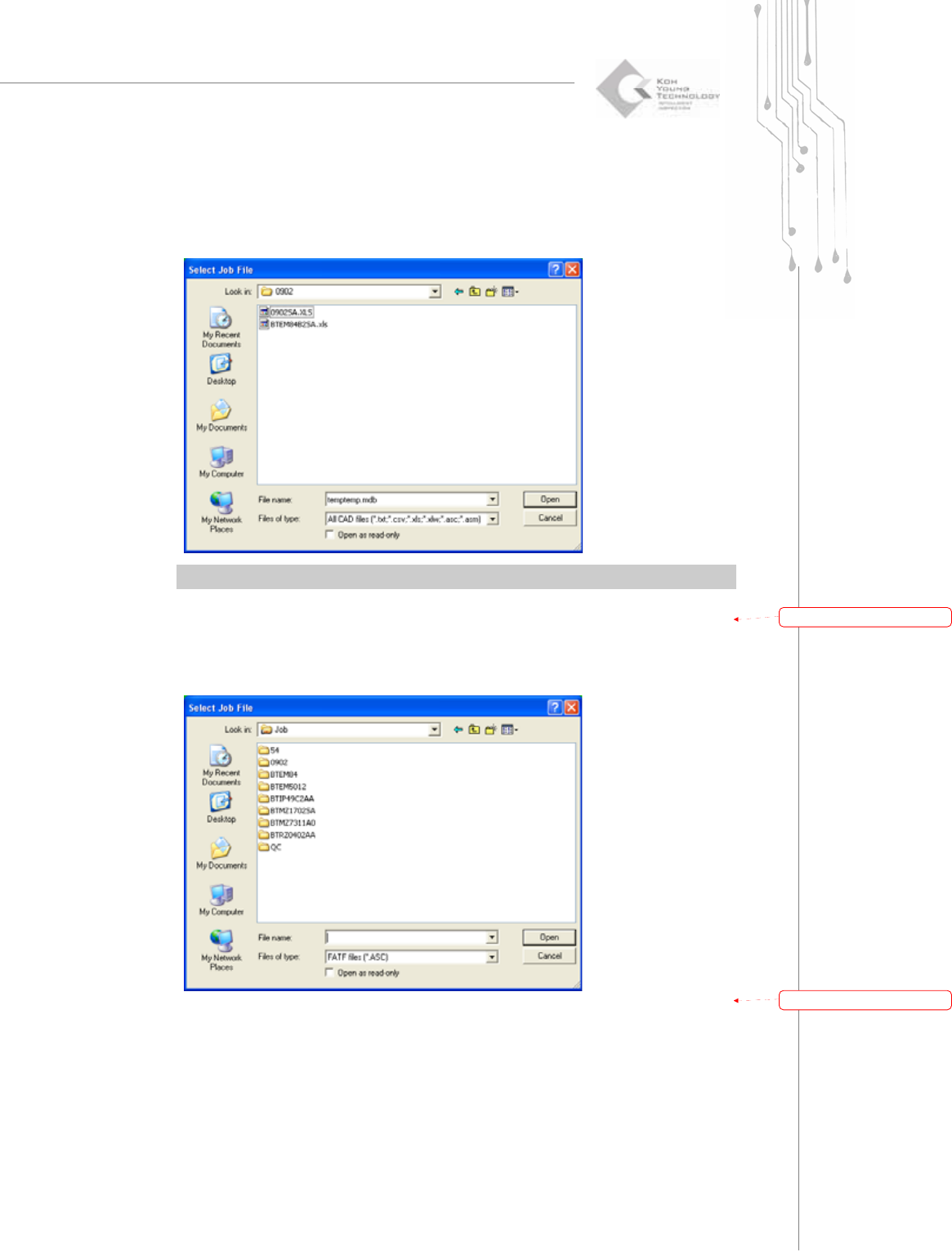 Programmers Manual | 87 5) Load Pin CAD File Load a Pin CAD file. The “Select Job File” Dialog Box ※ Note: CAD files such as *.txt, *.csv , *. xls, *.xlw or *.asc can be loaded. 6) Import CAD File Convert and import va…