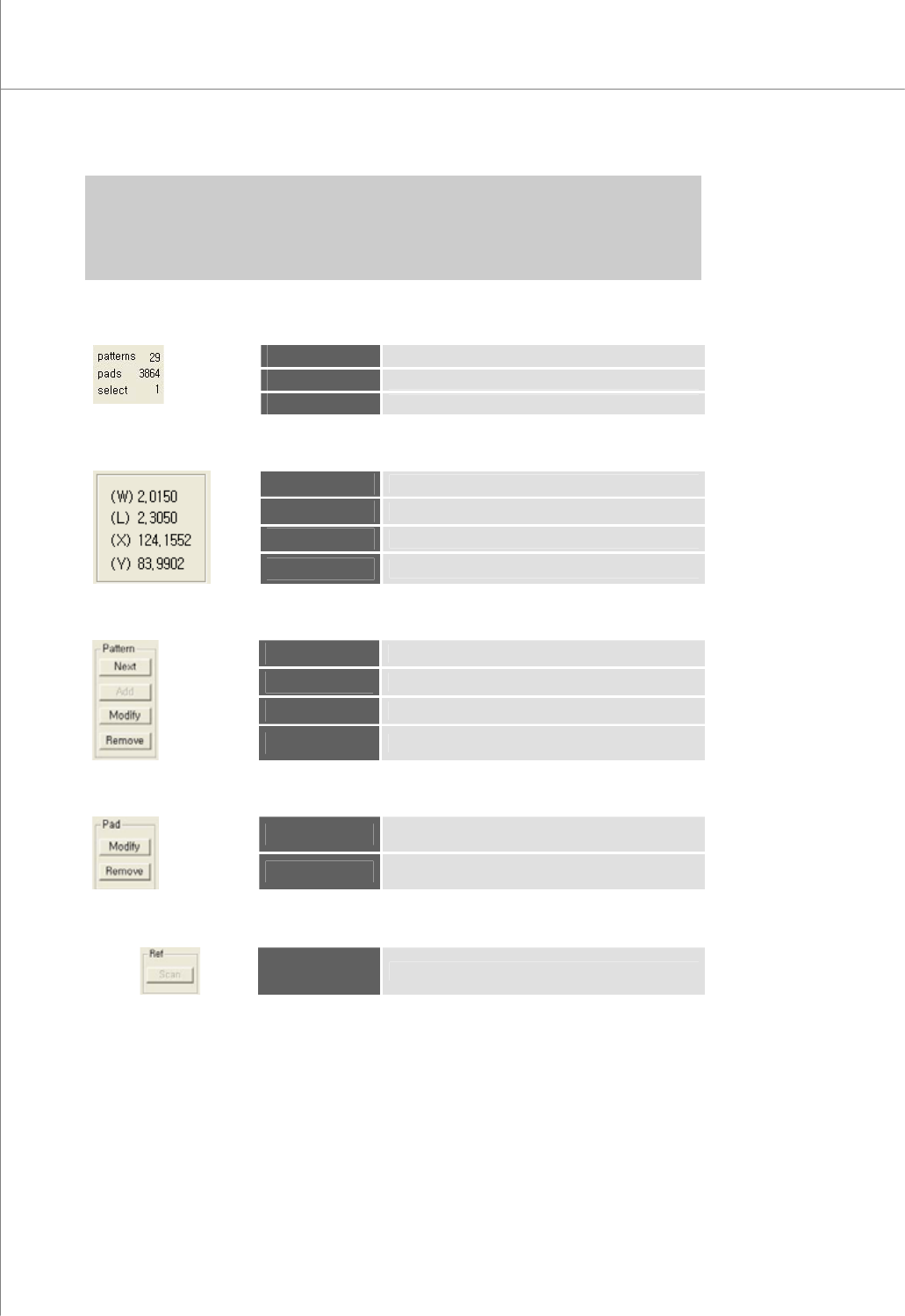 Programmers Manual | 9 1.1.7. Pad Bar 1) Full Display of the Pad Bar. 2) Pad List Pad Sort the list in ascending order of pad numbers. Pattern Sort the list in ascending order of pattern numbers. S Sort the list in ascen…