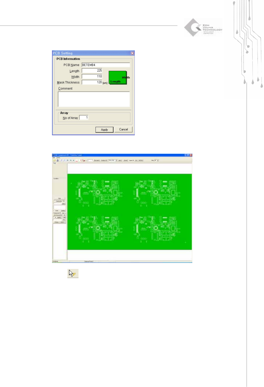 Programmers Manual | 75 6) Type the proper board size and the thickness of the stencil mask. Click Apply then the selected file will be opened. 7) Select in ord er to s et the fi ducia l. 8) Select pads which you wan t t…