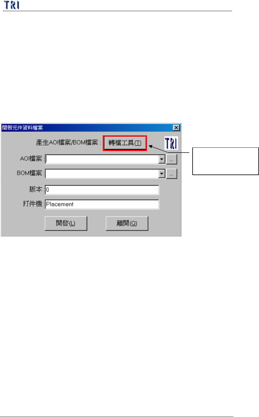 第 一 章 、 程 式製作 流程 T R 7500 E 使用手冊 2 l 在建立 新程式 時須將 C AD 檔案 轉 檔 成為 T R 75 00 可以 使用 的 AOI 檔案 ( * . a o i) 。系統 目前 有兩個預 設 轉 檔程式 ,分別為 [ F A B M a s t e r] 及 [ D e f a u l t] 。若 原 始的 C AD 檔案 為 F A B M a s t er 程式 所轉出的 A SC 檔案 ( …