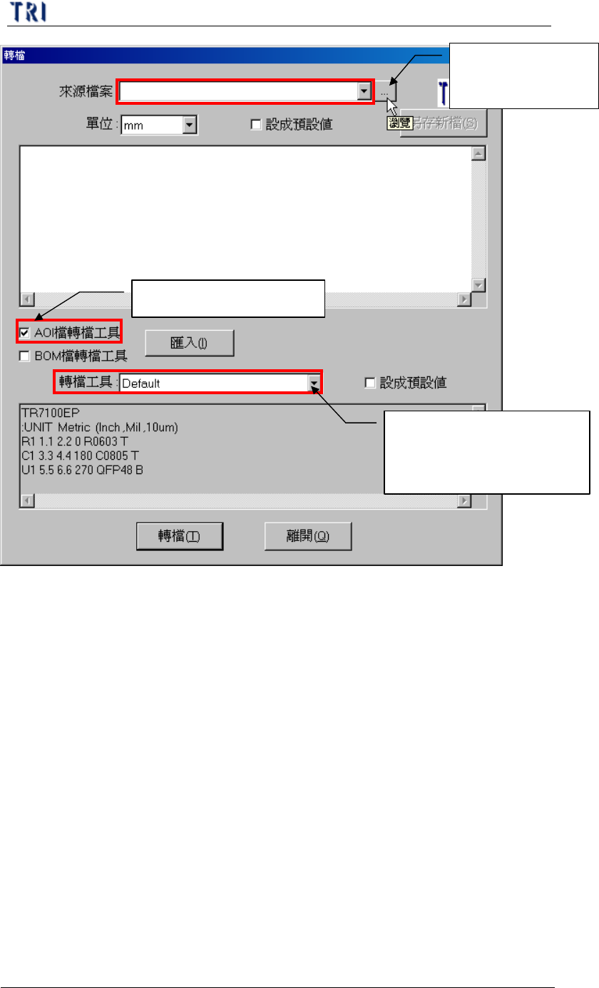 (*.aoi)。系統目前有兩個預設轉檔程式,分別為[FABMaster]及[Default]。若
