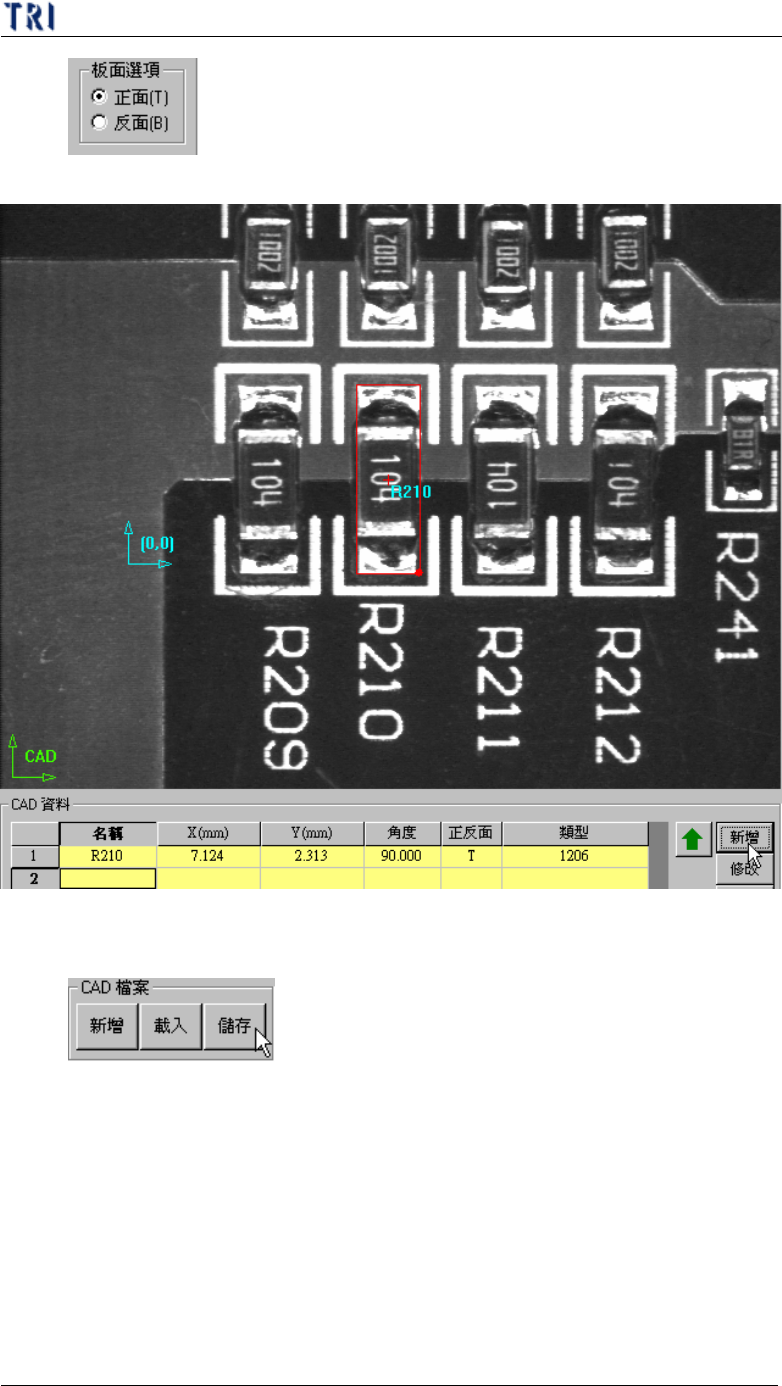 第 二 章、主 程 式 選 單介紹 T R 7500 E 使用手冊 92 4.7.4. 建 立 新座標檔 流程 步驟 1. 選擇 [ C AD 檔案 / 新 增 ] 來 開啟 一 個 新檔 。 步驟 2. 使用 [ 運動控制 ] 功能 或 在 影 像 中 點 選 滑鼠 右 鍵來 移 動攝影 機 位置 , 使用 [ 十 字 工具 ] 移 動 到 希望 的 位置 後 ,按下 [ C A D ( 0 , 0 )] , 設定原 點 位置 。 步…