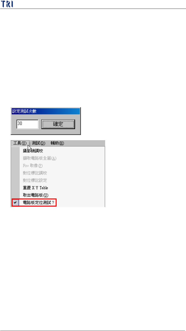 第 二 章、主 程 式 選 單介紹 T R 7500 E 使用手冊 1 06 l 敏感 度 – 設定定位標記 的 敏感 度 ,若 設定 為 40 分 ,表 示 在 搜 尋 範圍 內 找 到 與標 準 影 像 進 行 影 像 比 對 後 ,分 數 超 過 40 分的 物 件 即認 為其為 對位標記 。 7 . 6 . 重 置 X Y T a bl e ( R ese t X Y T a b l e ) l 按下此按 鈕 可將 C a m …