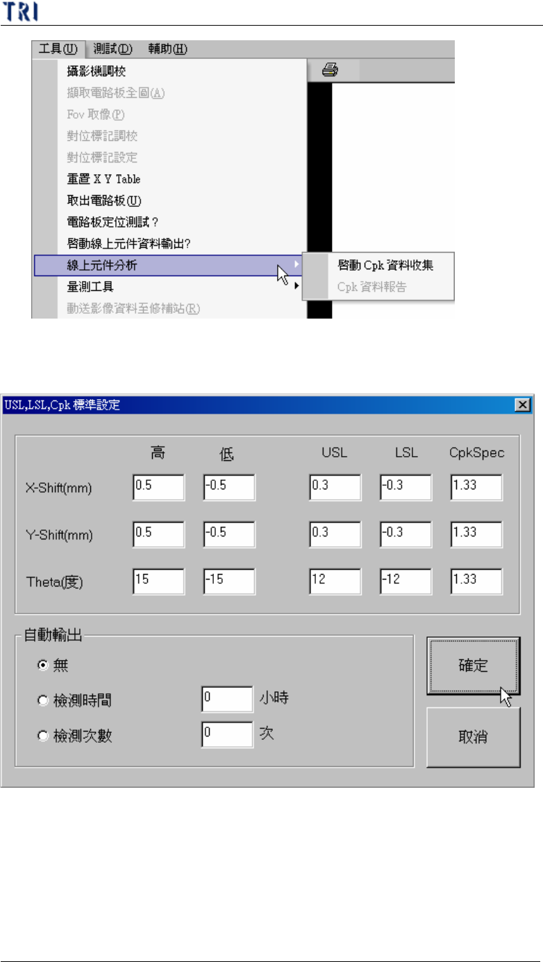 第 二 章、主 程 式 選 單介紹 T R 7500 E 使用手冊 1 08 此 值 視 為 異 常 。 n 無 – 不 自動 輸 出 n 檢測 時 間 –依 照 檢測 時 間 自動 輸 出 ( 單 位 : 小 時 ) n 檢測 次 數 –依 照 檢測 次 數自動 輸 出 7.9.2. C pk 資料 報 告 ( C p k D a t a R e po r t ) l 有 勾選 [ C pk 資料 收集 ] ,此按 鈕才會 作用 。 …